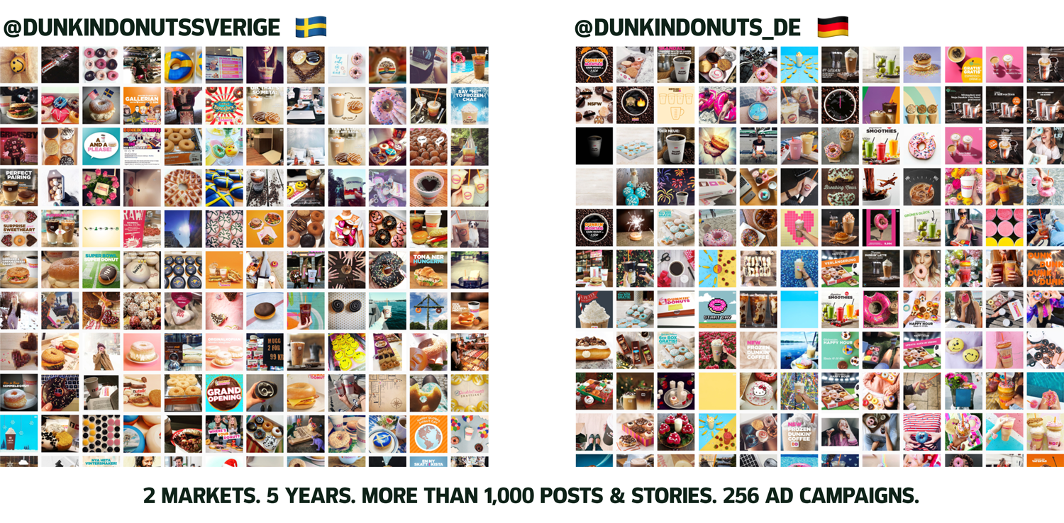 For over five years, we’ve been driving all of Dunkin’ Donuts’ social media on the Swedish and German markets. From campaign planning, creating, publishing and sponsoring content, to full community management in both Facebook and Instagram. Always on brand and always on a very stringent budget.